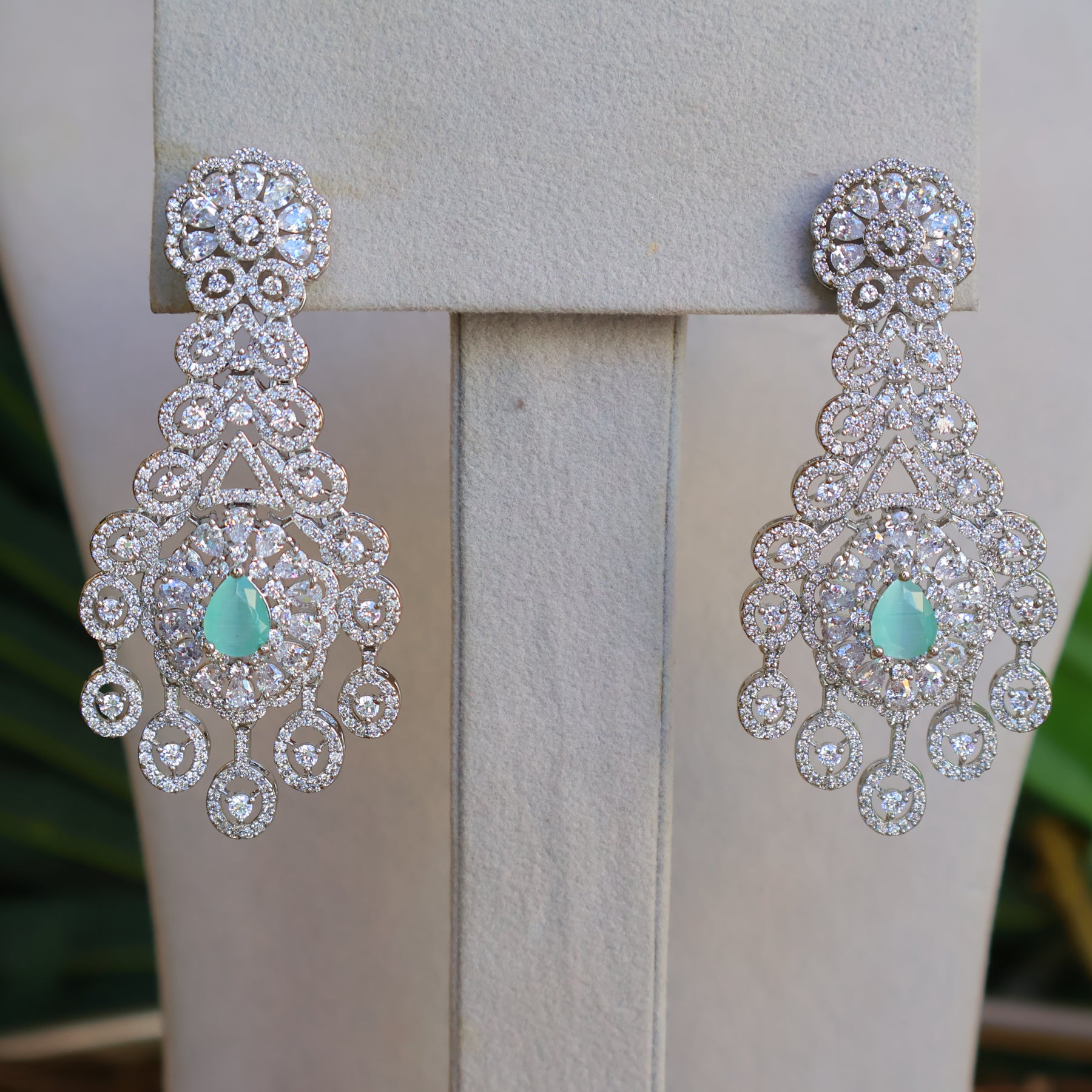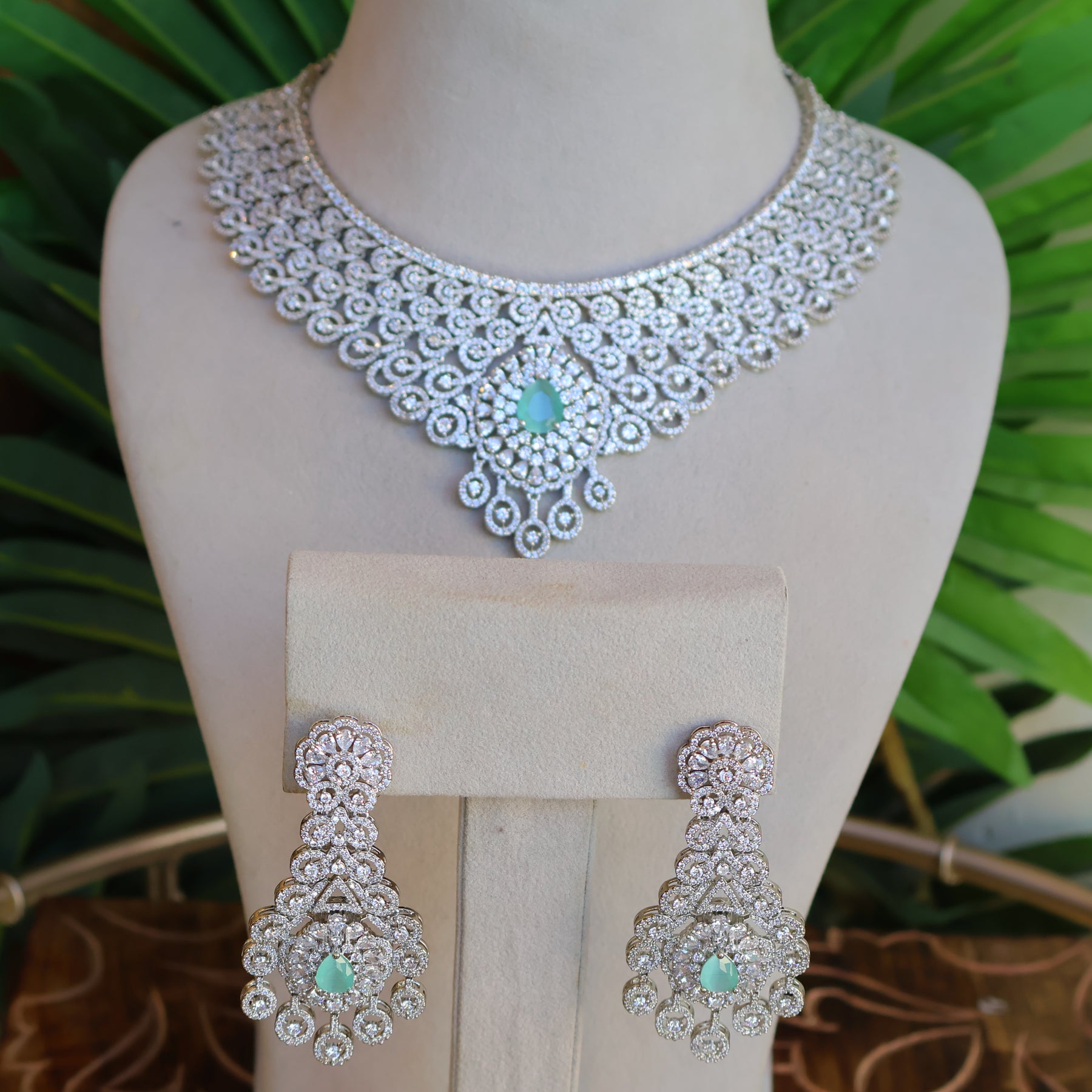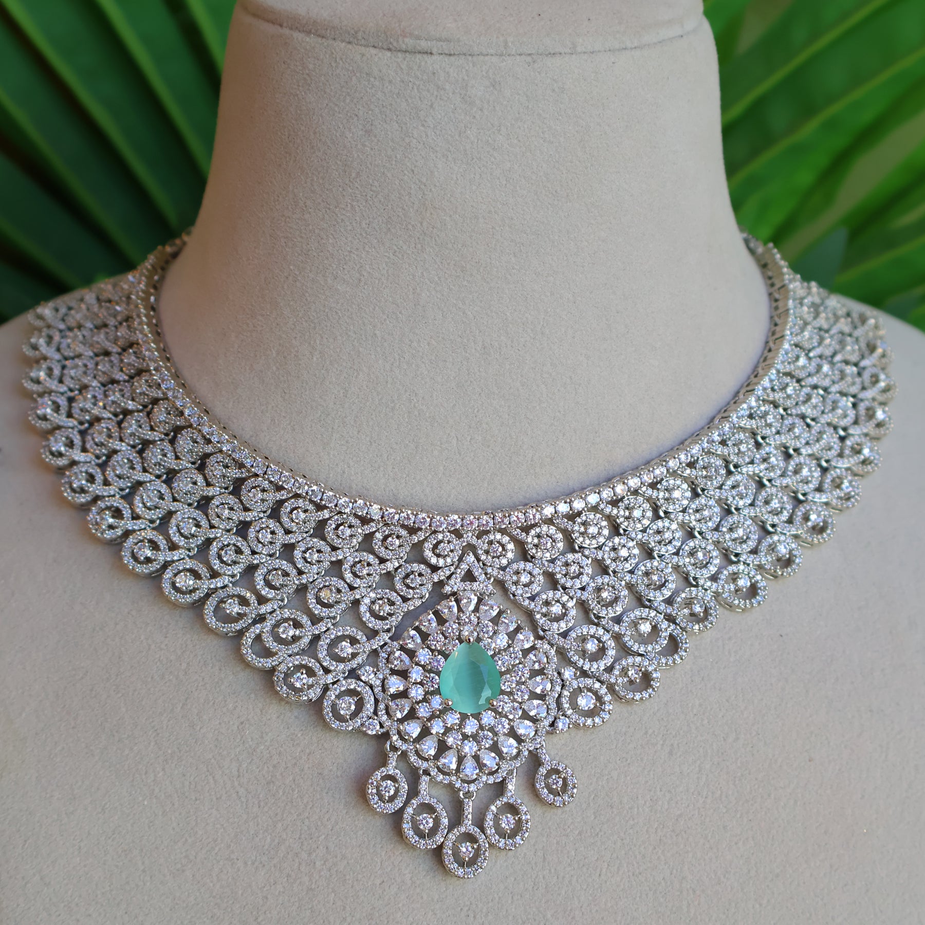 An exquisite display of brilliance and intricate craftsmanship, this set features a beautifully detailed choker with delicate lattice patterns and a soft mint green centerpiece. The fine sparkle of the stones creates a regal, radiant look, while the matching chandelier earrings add graceful movement and elegance. Perfect for weddings, receptions, and grand festive occasions, this set is designed to make a timeless statement.