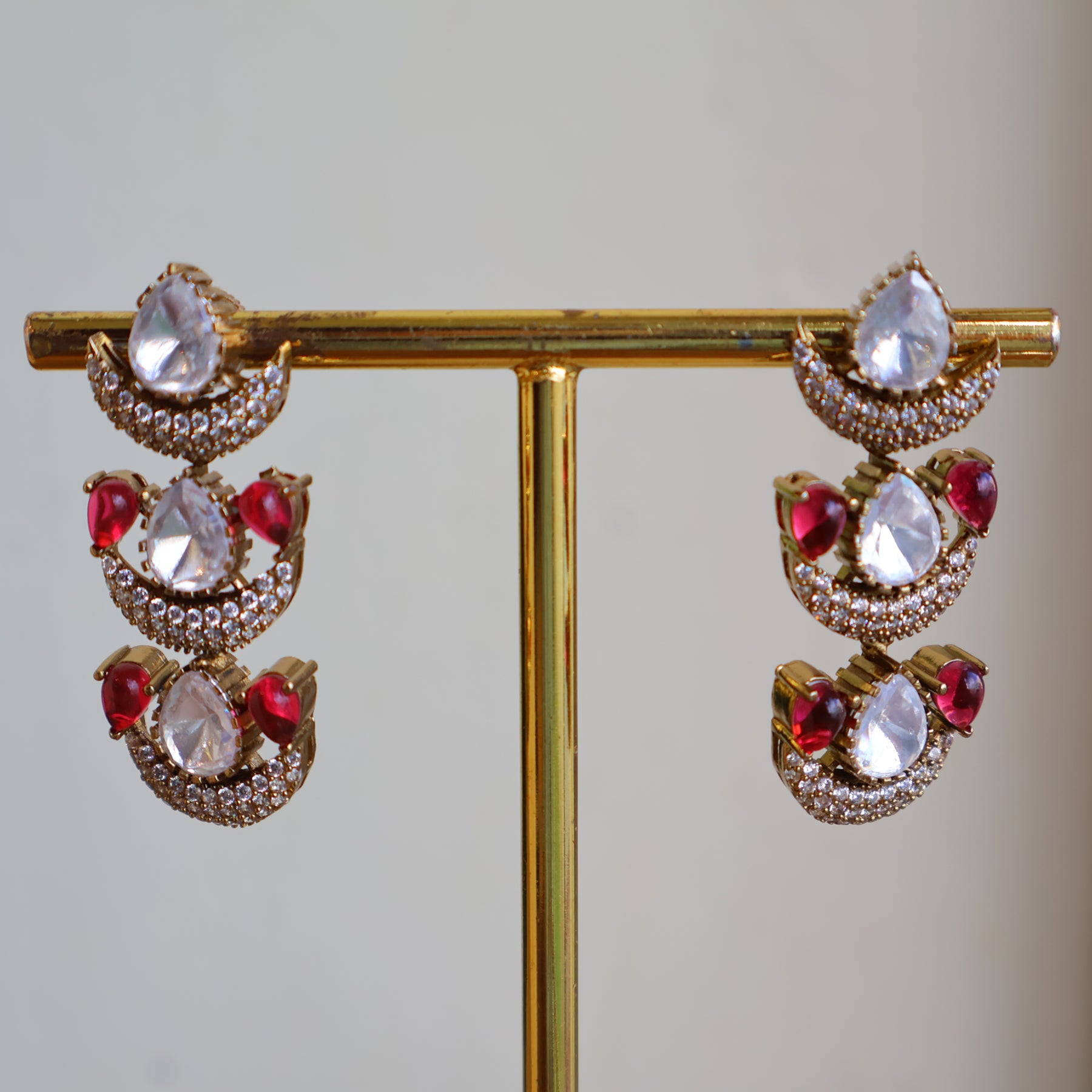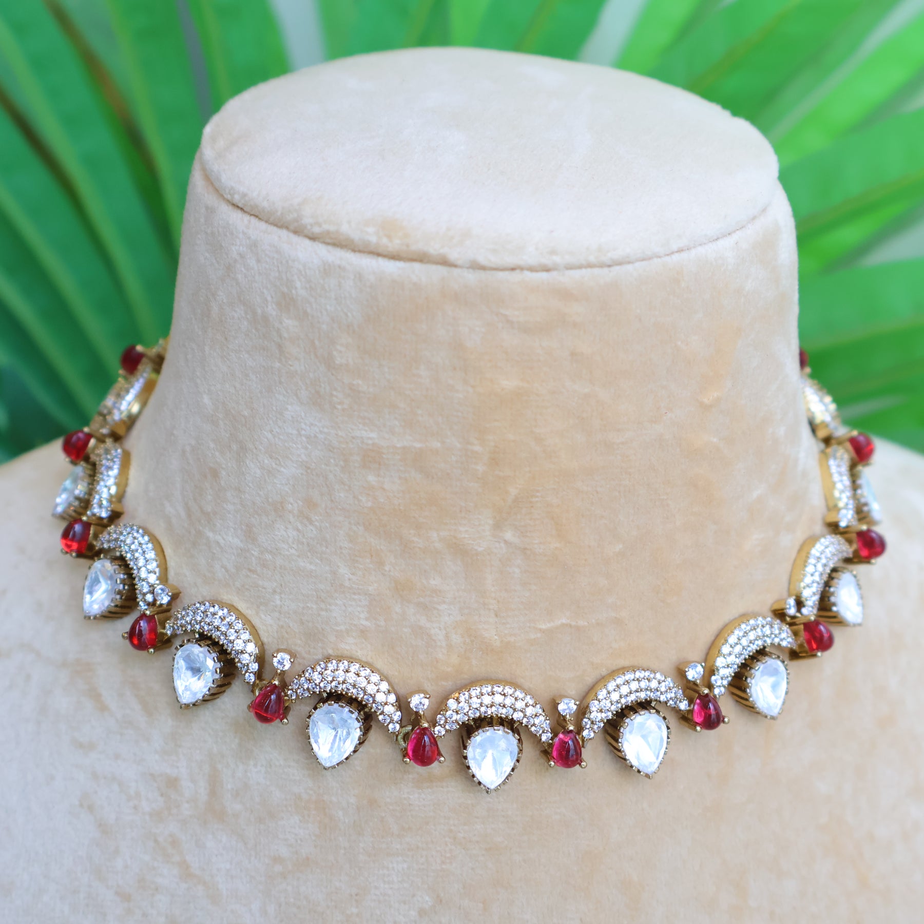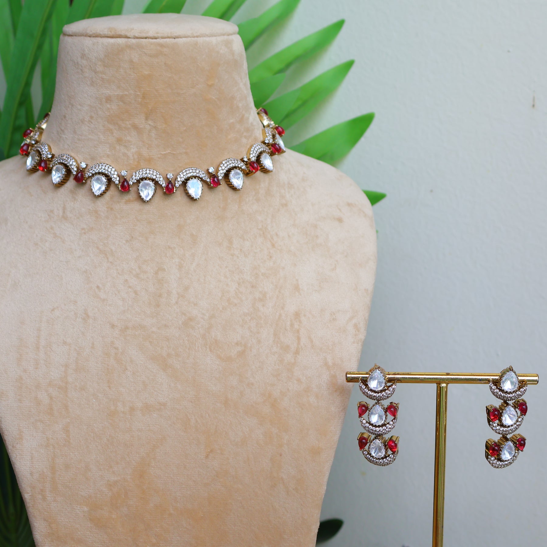 A delicate uncut moissanite and ruby choker set featuring fine scalloped detailing with pear-shaped stones and subtle ruby accents. Paired with elegant drop earrings, this lightweight piece is perfect for graceful festive and semi-bridal styling