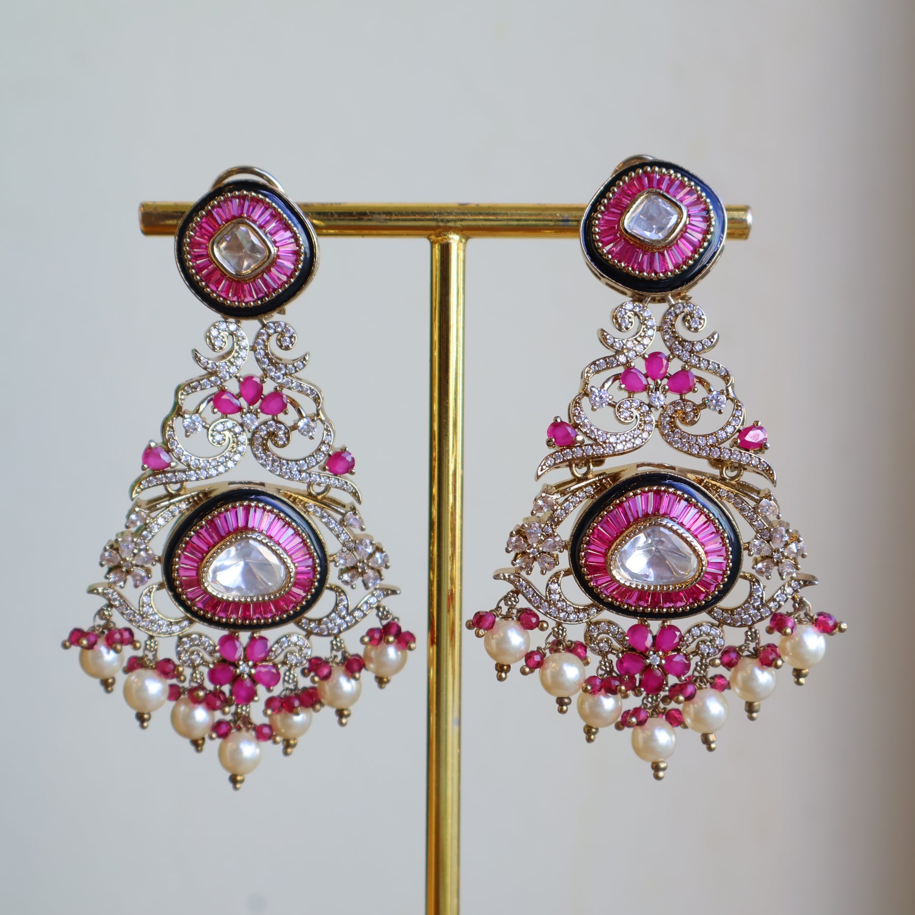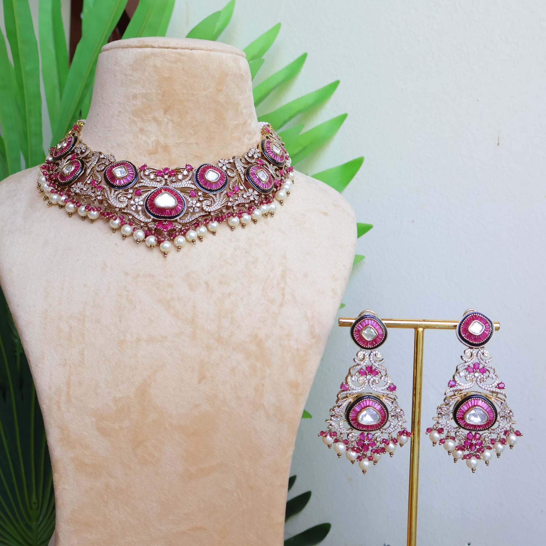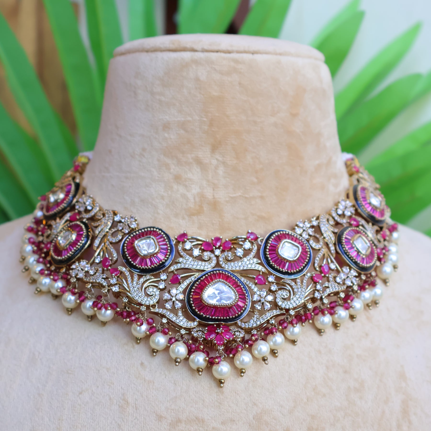 A stunning uncut moissanite and ruby choker set featuring intricate pink enamel detailing with radiant stonework, finished with delicate pearl drops. Paired with statement chandbali-style earrings, this set brings a perfect blend of royal elegance and festive charm.