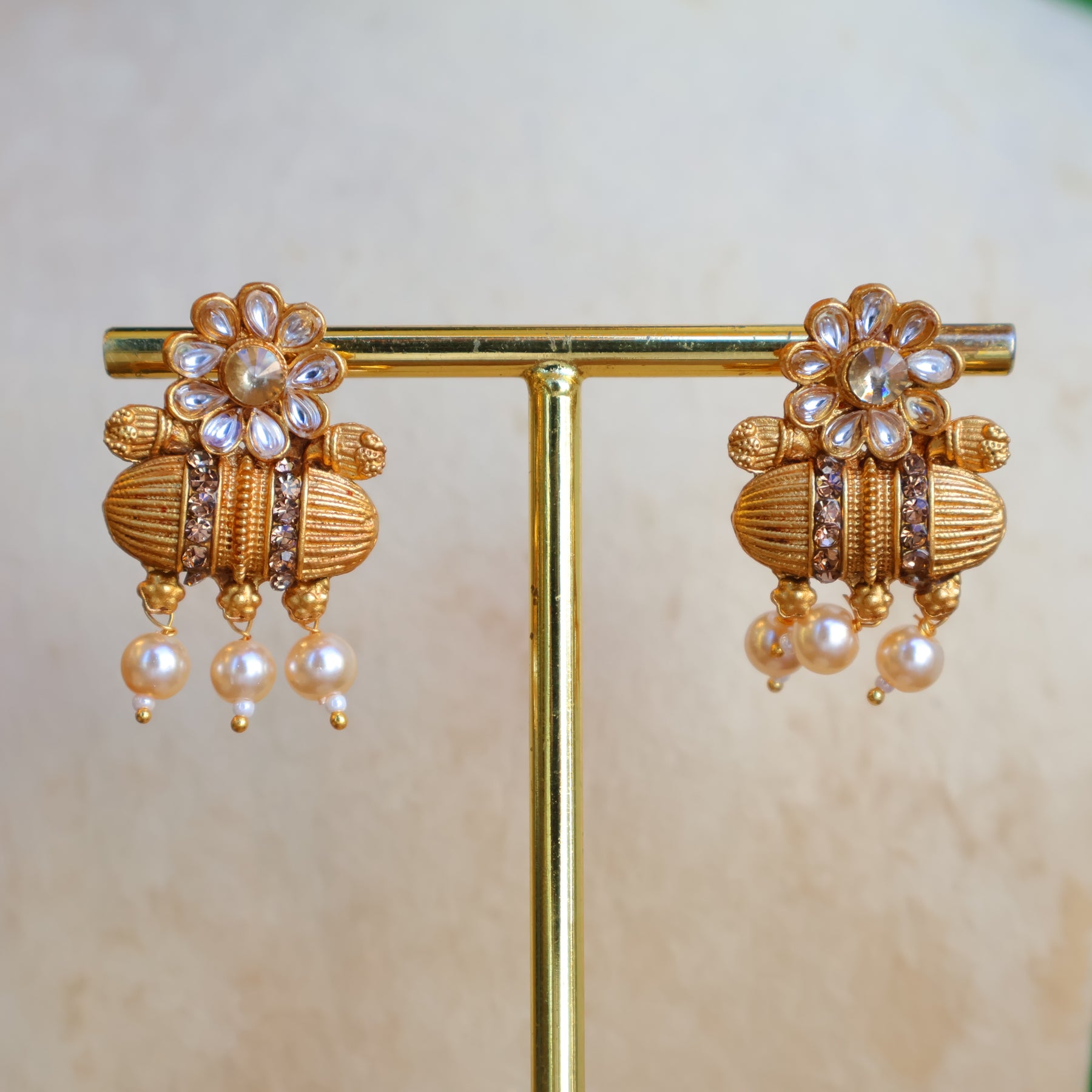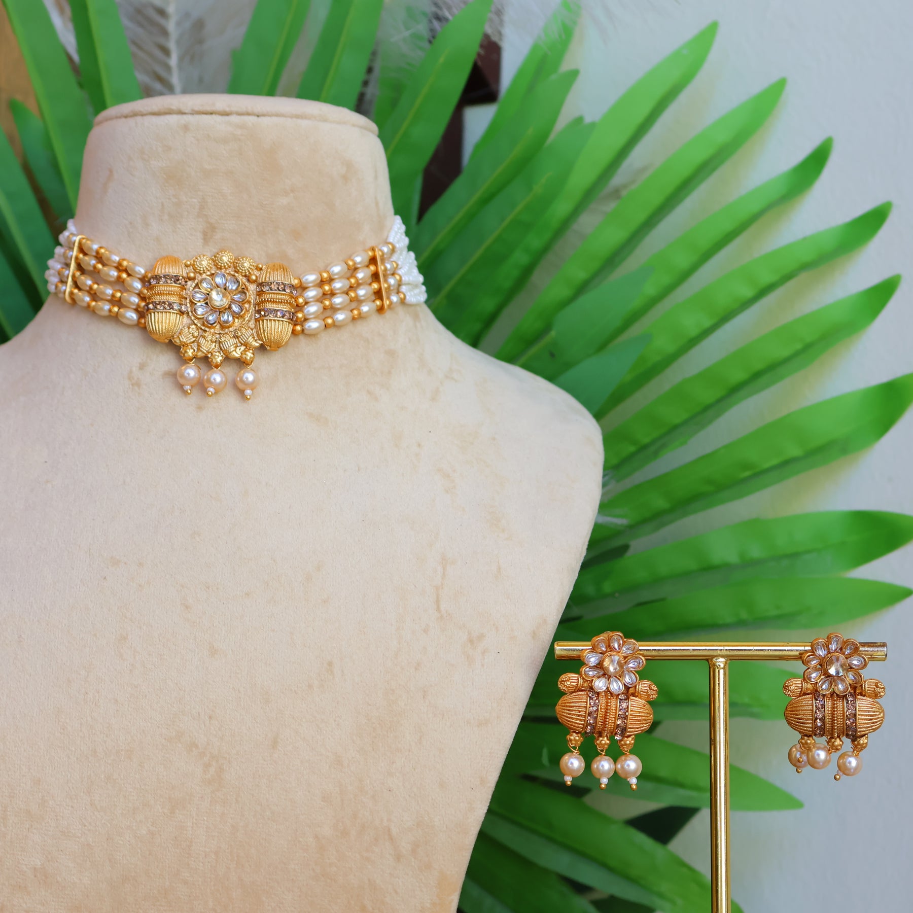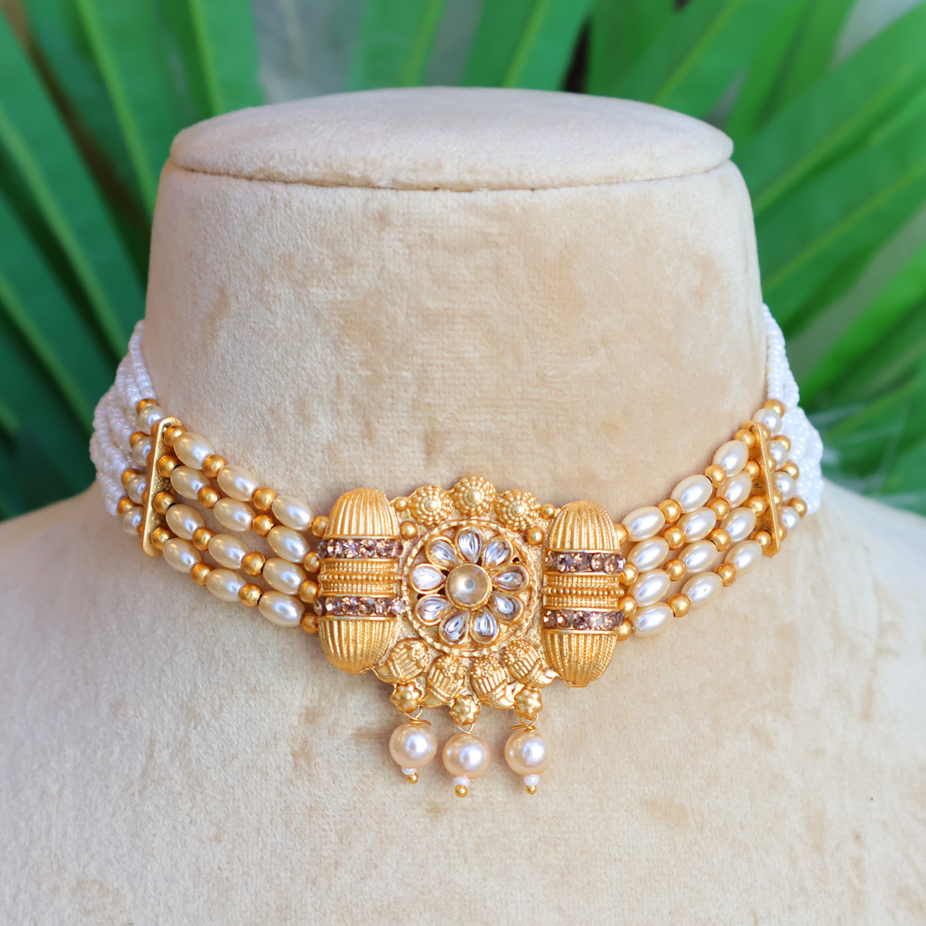 From our Gold Plated Antique Collection, this refined choker showcases layered pearl strings paired with a beautifully carved floral centerpiece in antique gold finish. Accented with subtle pearl drops and matching earrings, it offers a graceful, timeless look—perfect for intimate celebrations and elegant festive wear.