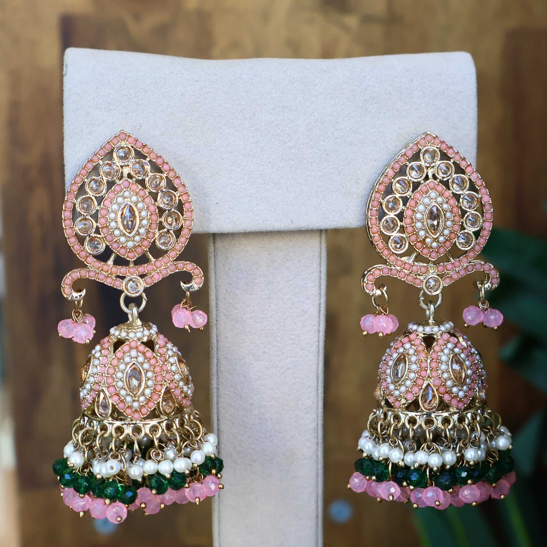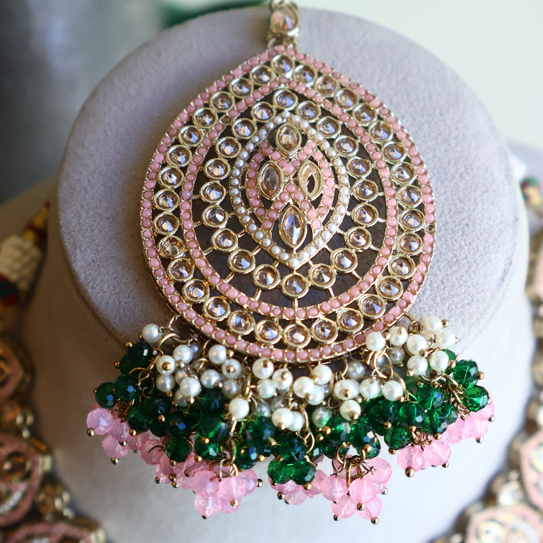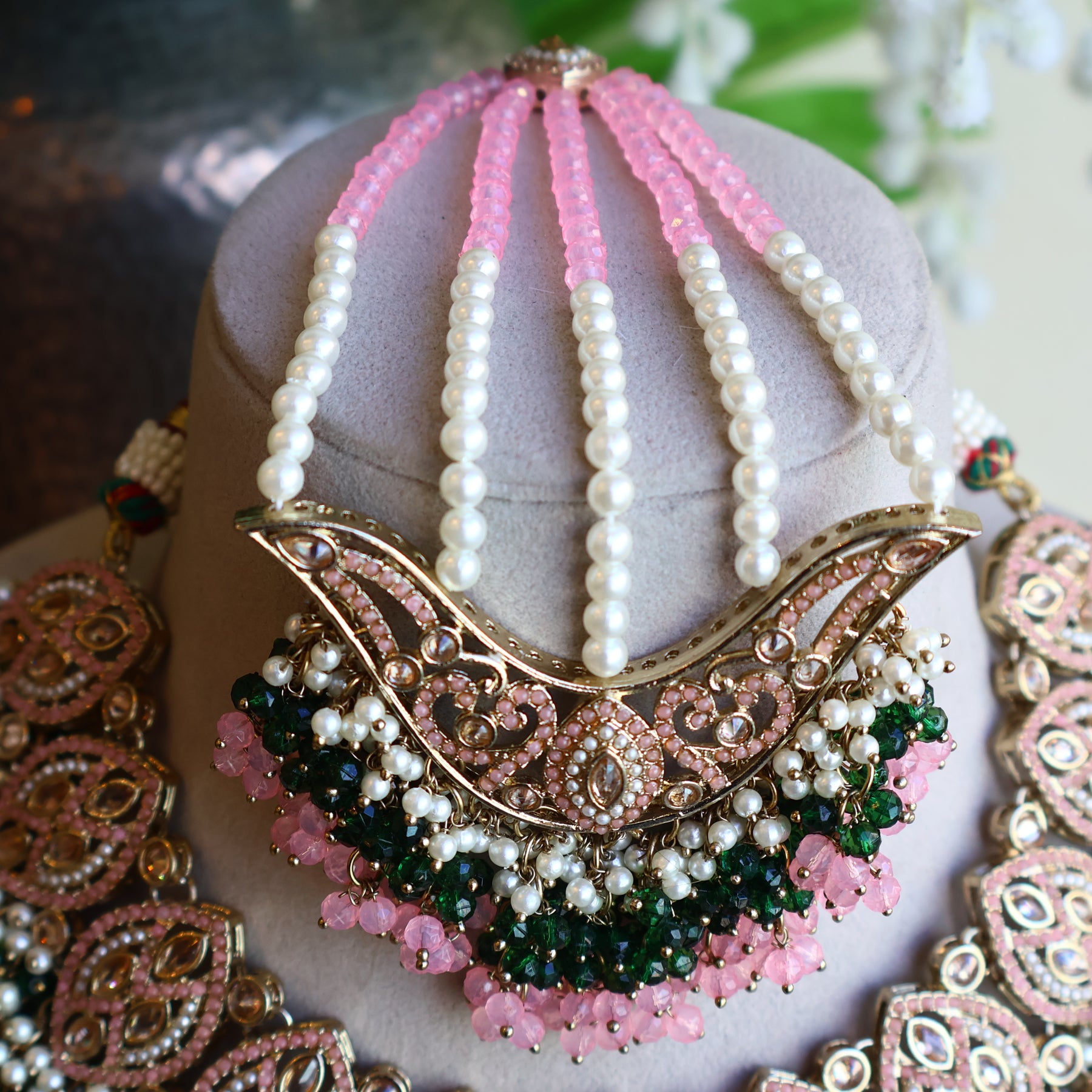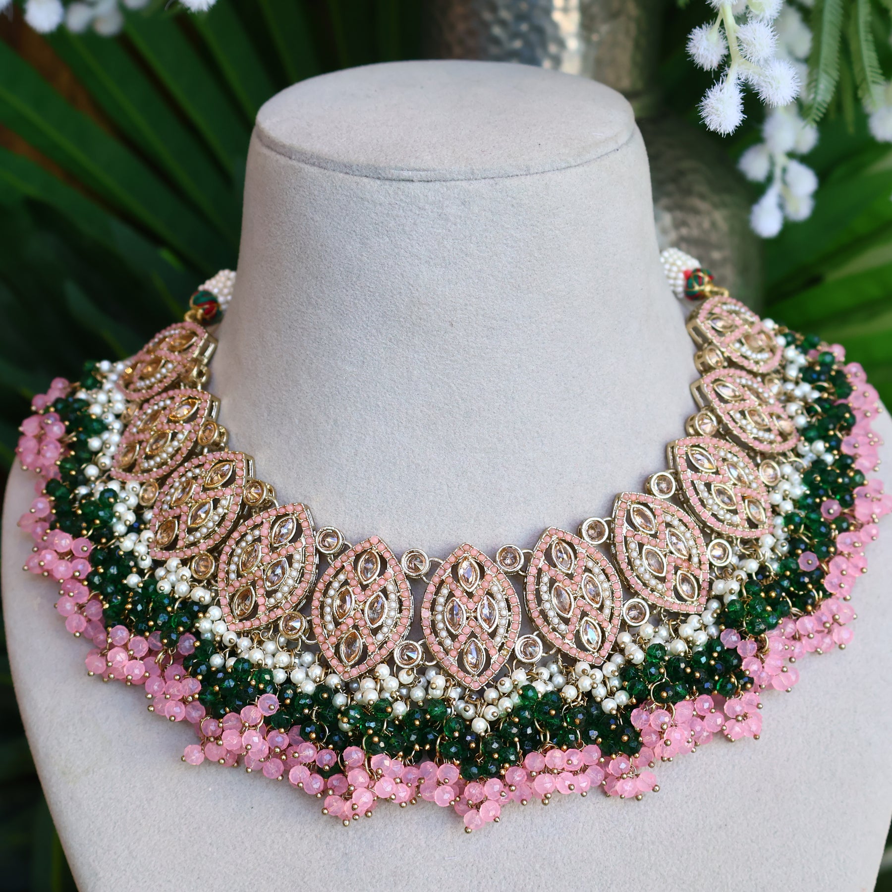 Exquisite polki choker set featuring blush pink detailing, rich green beads, and pearl accents, paired with elegant earrings and a matching passa. A graceful semi-bridal piece designed to add timeless charm to festive and wedding looks.