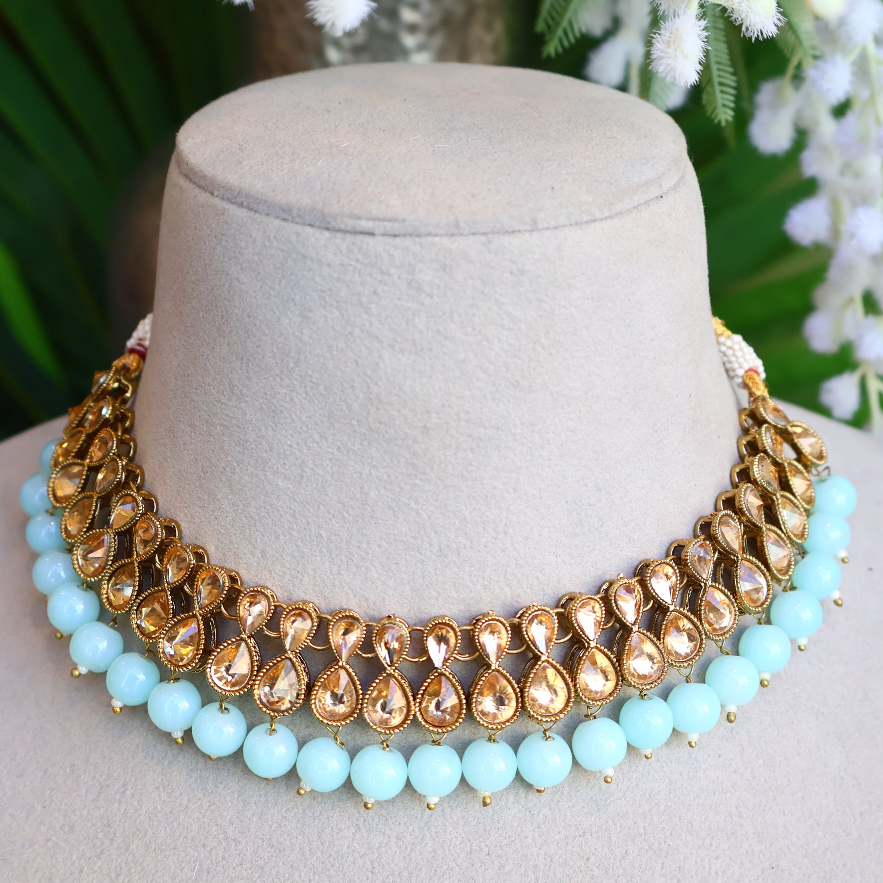 A graceful kundan choker adorned with champagne-toned stones and soft sky-blue beads, finished with delicate jhumka-style earrings. Its minimal yet elegant design makes it perfect for intimate celebrations and daytime festivities.