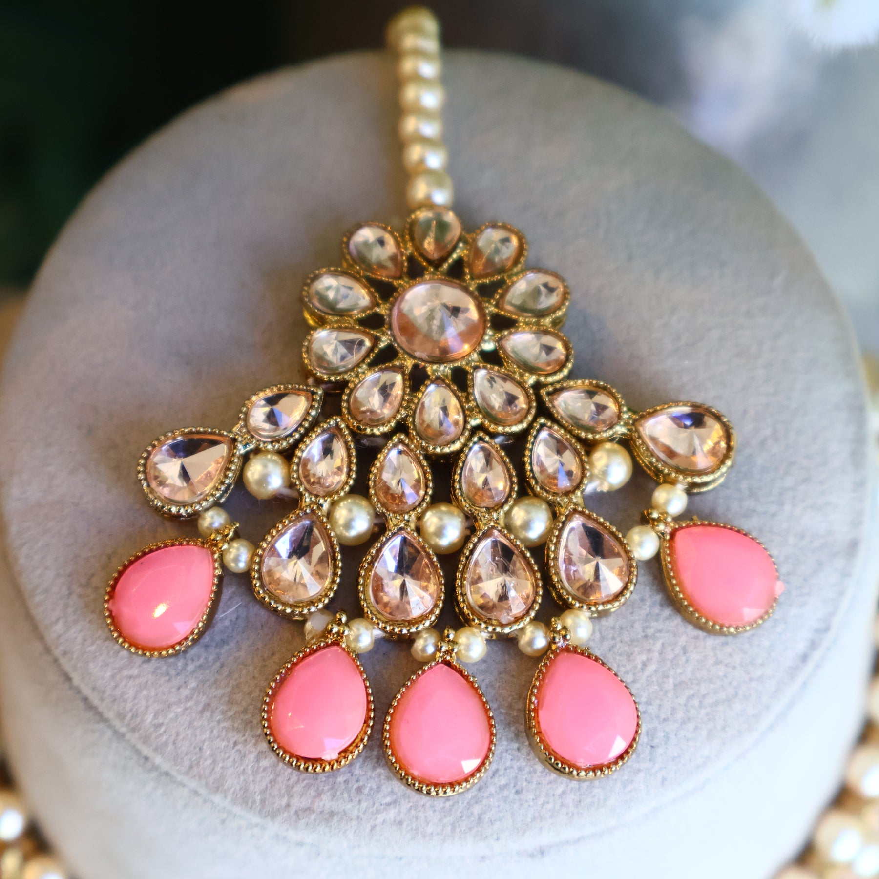 Graceful kundan choker adorned with layered pearls and blush pink drop accents, paired with statement earrings and a matching tikka. A perfect pick for elegant festive and bridal looks.